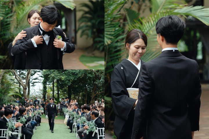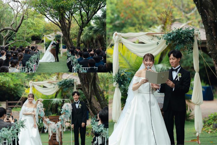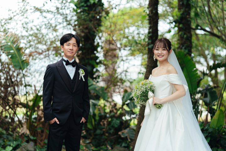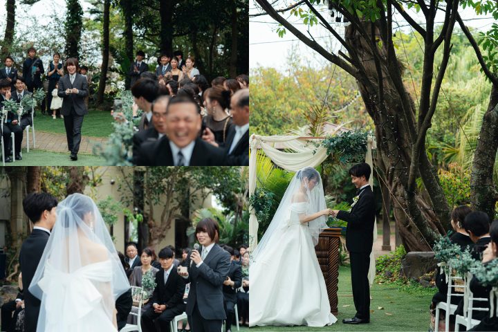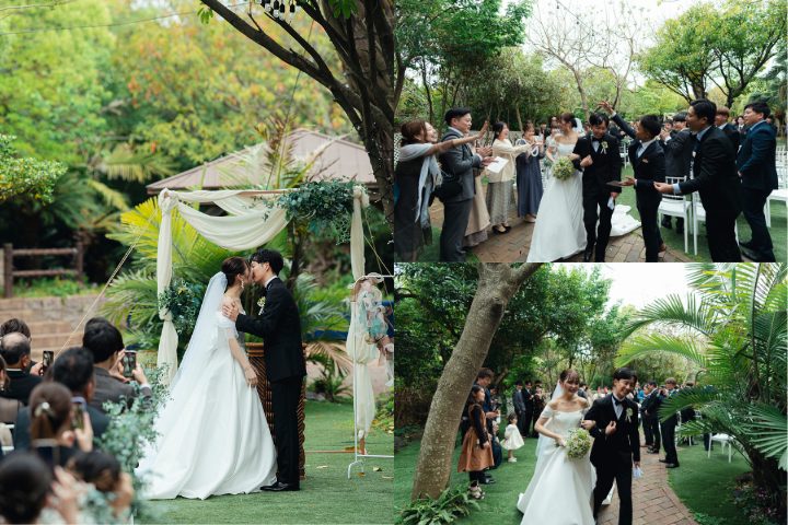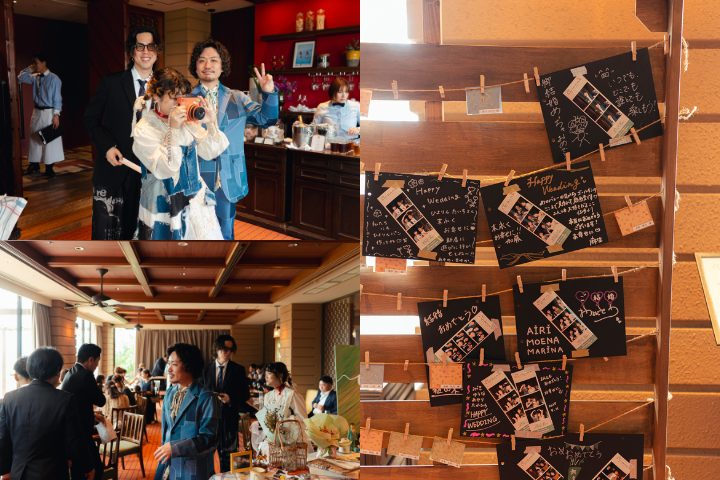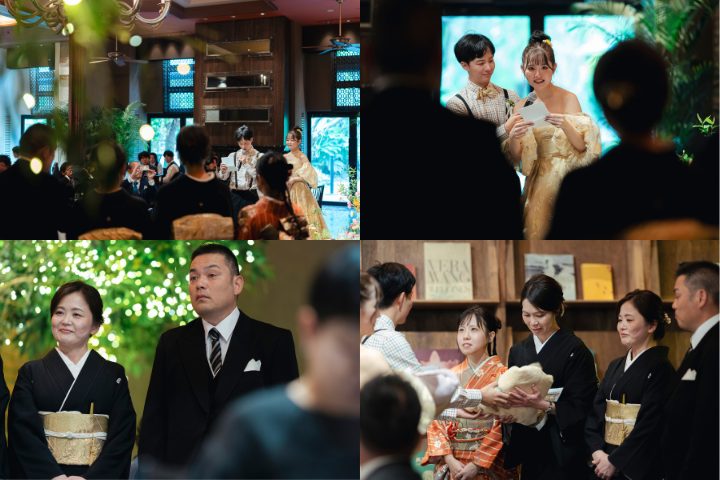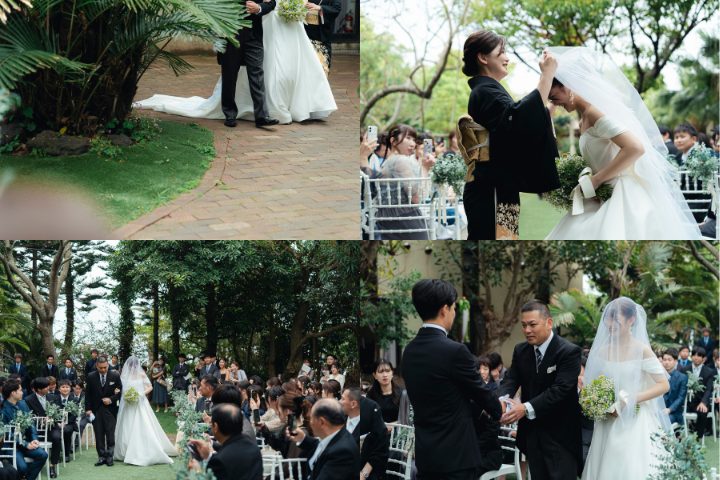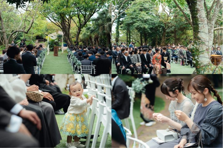 party report ザ・ルイガンズ.スパ & リゾートのパーティーレポート 【NEW!】「感謝を伝えるおもてなし」一緒につくるウェディング 披露宴会場 : THE GRAND GARDENⅡ 挙式スタイル : 人前式 参列人数 : 94名 お仕事の関係で出会われたおふたり 親御様やご家族への感謝を伝え みなさまで一緒に楽しく過ごしたい そんな思いで作られた 新緑のなかで過ごす あたたかいガーデンウェディングをご紹介いたします ーWedding dayー 穏やかな風が吹く5月 鮮やかな新緑が ホテルの周りを彩ります ーFirst meetー チャペルでのファーストミート 今日まで内緒ですすめてきた 特別なお姿 初めて見るお互いのお姿に笑みがこぼれます そして新婦様から新郎様へ サプライズでコルクボードの贈り物 新郎様の素敵なところをたくさんしたためたメッセージがたくさん おふたりがお互いを想う あたたかい時間が流れます ーFamily meetー そのまま おふたりの親御様とのファミリーミート お互いが涙ぐみ 今日の門出をお祝いするような ご家族の素敵なお時間となりました おふたりはプライベートガーデンでも ゆっくりとおふたり写真をおさめます ーWelcome Spaceー ウェルカムスペースは鮮やかなウェルカムボードと お二人が撮りためたお写真や思いでのお品がみなさまを迎えます プリントシール機もご用意され おふたりへのお祝いのお言葉やお写真で ボードが埋め尽くされていました ーCeremonyー 挙式は新緑が彩るイングリッシュガーデンにて ウェルカムスペースでみなさまにお持ちいただいた スイッチングレターをみなさまに読みすすめていただくことから 挙式がスタートします そしてご新郎様のご入場 お母様から ジャケットセレモニーをいただき みなさまの前へすすまれます 続いて新婦様のご入場 バージンロード前で お母様からベールダウンを受け お父様とご一緒に ゆっくりと新郎様のもとへと歩まれます たいせつな指輪は 新婦様の弟様に リングベアラーとしてお運びいただきます おふたりにお祝いのお言葉をいただき あたたかいご家族の絆が見える 穏やかなお時間となりました ベールアップののち 誓いの言葉 結婚証明書は ウェルカムスペースでゲストのみなさまに1本ずつ付けていただいた ゲスト参加型のもの おふたりがお仕上げをしてお披露目です 誓いのキスののち結婚成立宣言 おふたりはリーフシャワーとあたたかい拍手のなか挙式の結びとなりました ナチュラルガーデンがテーマ 新婦様のお好きなオレンジ・アプリコット系をベースとした ナチュラルで優しい雰囲気で 会場をデザインしました 挙式を結び ゲストのみなさまはご披露宴会場へ ウェルカムスペースでみなさまの手に渡った おふたり手作りのプロフィールブックをご覧になられたり ご用意されたビールやドリンクで乾杯されたり 同じテーブルになった 久しぶりに合うご友人や 親しい職場のみなさま リラックスされたご様子で新郎新婦のご入場を待ちます おふたりが作られたオリジナルのオープニングムービーののち いよいよおふたりのご入場です 新婦様はベールを外され ヘアアクセサリーをあしらった新たな装い 弾けるような笑顔の新婦様を より明るくしてくれます 新郎様からのウェルカムスピーチをいただき おふたりからお越しいただいたゲストのみなさまのご紹介 そして おふたりから乾杯のご挨拶 乾杯後のメインテーブルには おふたりへお祝いの言葉を伝えるゲストの方々でいっぱい 順番におふたりを囲んで写真撮影がはじまります それぞれのご友人代表の方よりあたたかいスピーチをいただき ケーキ入刀 ファーストバイトへとお時間はすすみます 幸せな瞬間に ゲストのみなさまもカメラを持っておふたりの周りへ 鮮やかなフルーツをあしらったウェディングケーキが より華やかにおふたりを彩ります 続いて5月の母の日にちなんで それぞれの親御様へ感謝のサンクスバイト 少し照れくさそうに でもとても幸せな笑顔を浮かべるみなさま カメラを構えるご家族やゲストのみなさまも とても幸せそうに笑顔を浮かべていらっしゃるお姿が印象的でした お色直しのエスコートには 新婦様はお祖父様とお祖母様 新郎様はお祖母様をご指名 あたたかい大きな拍手のなか それぞれ会場をあとにされます 会場ではお食事を楽しまれたり 懐かしいお話で盛り上がるなか お支度が整ったおふたりのお部屋ではセカンドミートが お色直しのご準備も内緒ですすめられていたおふたり ヘアスタイルやドレスもがらりと雰囲気を変えられ 華やかな笑顔が映えるお衣装の新婦様 新郎様もドレスに合わせた色合いでよくお似合いでした おふたり手作りのプロフィールムービーを上映したのち あらためてご入場 大きな拍手のなか おふたりの明るい笑顔がより会場を盛り上げます ここでおふたりへサプライズムービーのプレゼント 学校関係のお仕事のおふたり 職場である学校の生徒さんや先生から お祝いのムービーです 会場のみなさまもあたたかい笑顔で映像をご覧になら