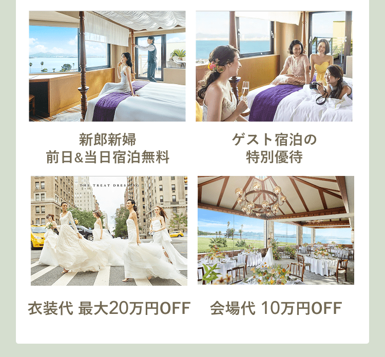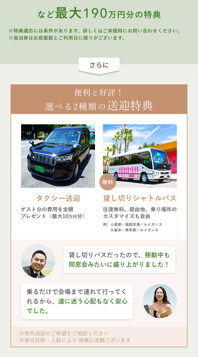 ホテルの全館はバリアフリーで、車椅子やベビーカーでお越しの方も安心。お車でお越しの方も100台まで無料駐車場を完備。ご列席者の方はご優待価格で宿泊できたりと、遠方の方もご安心いただけるようになっております。シャトルバスはご両家専用の貸切。おふたりが行き帰りともに経由を自由にカスタマイズできます。