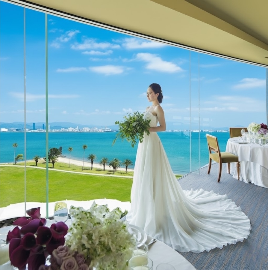 可实现整栋包租的全景婚礼的宴会厅“The Grand Ocean”。是建在酒店外的完全包租类型的会场。可以整层包租,最适合人数少的婚礼。与亲戚等非常亲密的客人的近距离接触,开放式厨房送来的料理的款待,木甲板上的片刻时光等,奢华的私人婚礼。